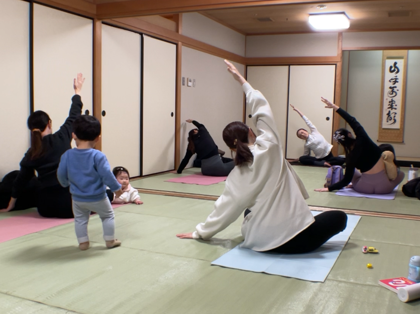 A:動きやすい服装、水分、タオル、いつものお出かけセット(オムツ・おもちゃ等)だけでOKです!ヨガマットマット貸し出し有!(初回無料)